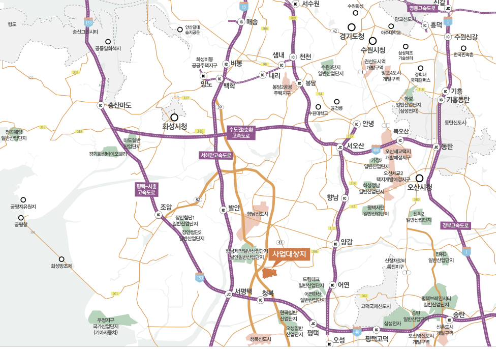 최상의 교통 인프라3개 국제공항(인천·김포·청주) 1시간 이내 도달 , 평택항 20분 이내 도달 중국·동남아 교역의 전초기지 , 서해선 복선전철 15분 이내 도달 신안산선과 연계하여 40분 이내 서울 접근 가능